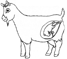 Many veterinarians insist on extracting both front legs to accompany the head. This is not necessary in goats, as the fetus is sufficiently streamlined with only a head and one leg out. It can take too much valuable time to find and extend the second front leg, and it's not worth the time or trauma to the doe. In fact, when the fetal shoulders are very bulky, it can be advantageous to put one front leg back inside the doe and align it beside the fetus to reduce bulky shoulders. |